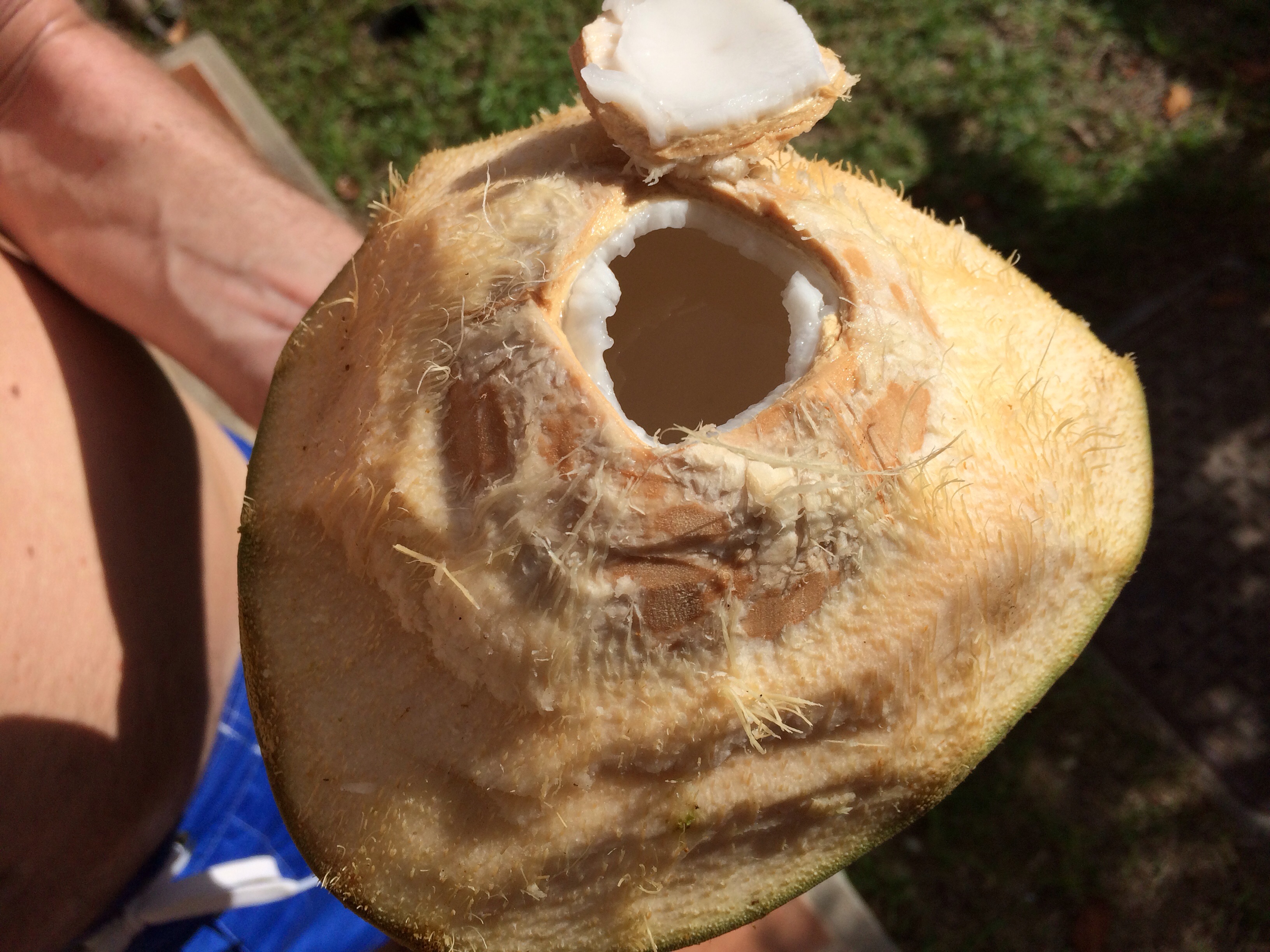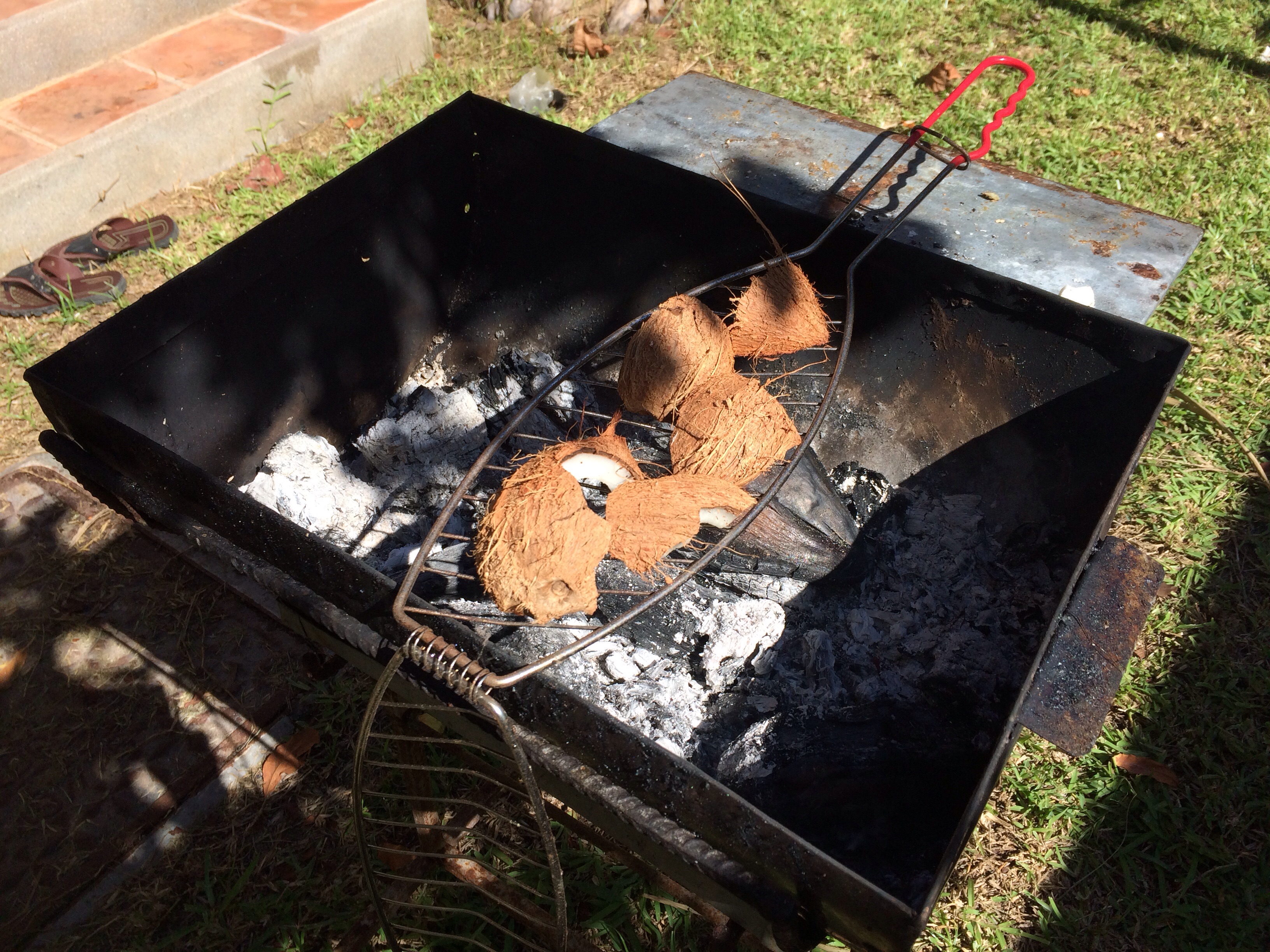 Wir kennen sämtliche Entwicklungsstufen der Kokosnuss – von der ganz jungen Trinkfrucht bis hin zur „Coco Zerm“ – Sven kann eine komplette Frucht per spitzem Holzpflock von der Außenschale befreien und mit speziellem Zubehör (grape coco) das Fruchtfleisch aus der Nuss raspeln um so die für´s Curry-Gericht notwendige Kokosmilch herzustellen.