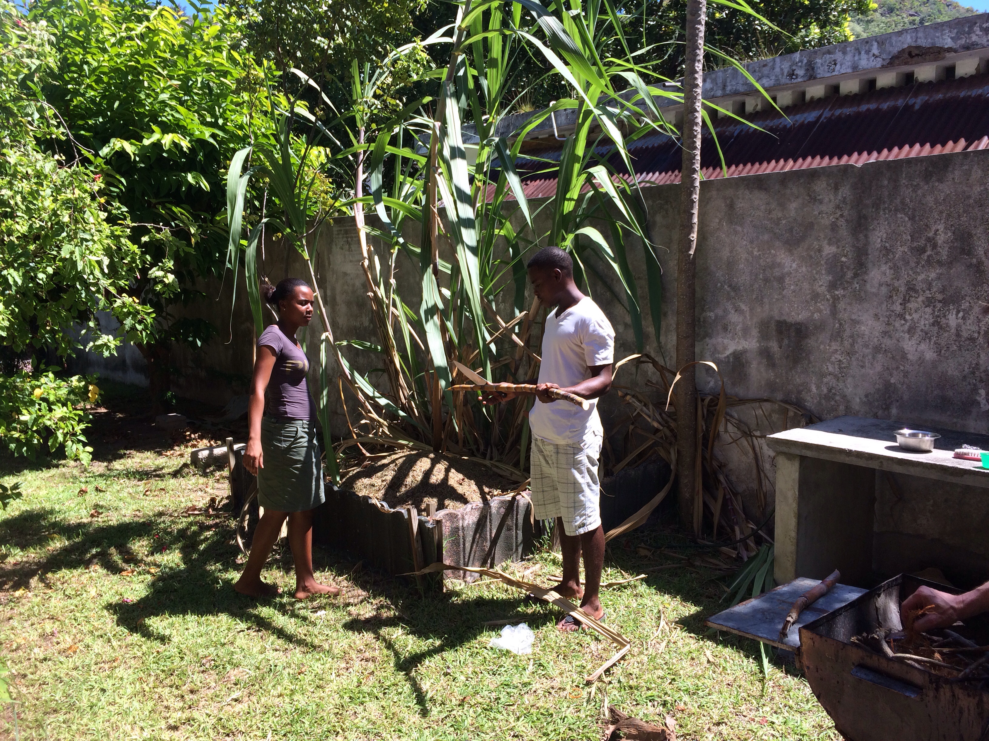 Im Garten steht auch Zuckerrohr, da wird dann mal eben ein Rohr gekappt und entsprechend mit Machete oder großem Küchenmesser zurecht geschnitten: schon hat man Stückchen aus denen man den süßen Saft herauskauen und -saugen kann. Lust auf Lemongras-Tee? Kein Problem, fix in den Garten gegangen, einige Grashalme aus den üppigen Grasbüschen geschnitten, heiß Wasser drauf: Schon ist feinster, voll aromatischer „Citronelle“-Tee fertig!