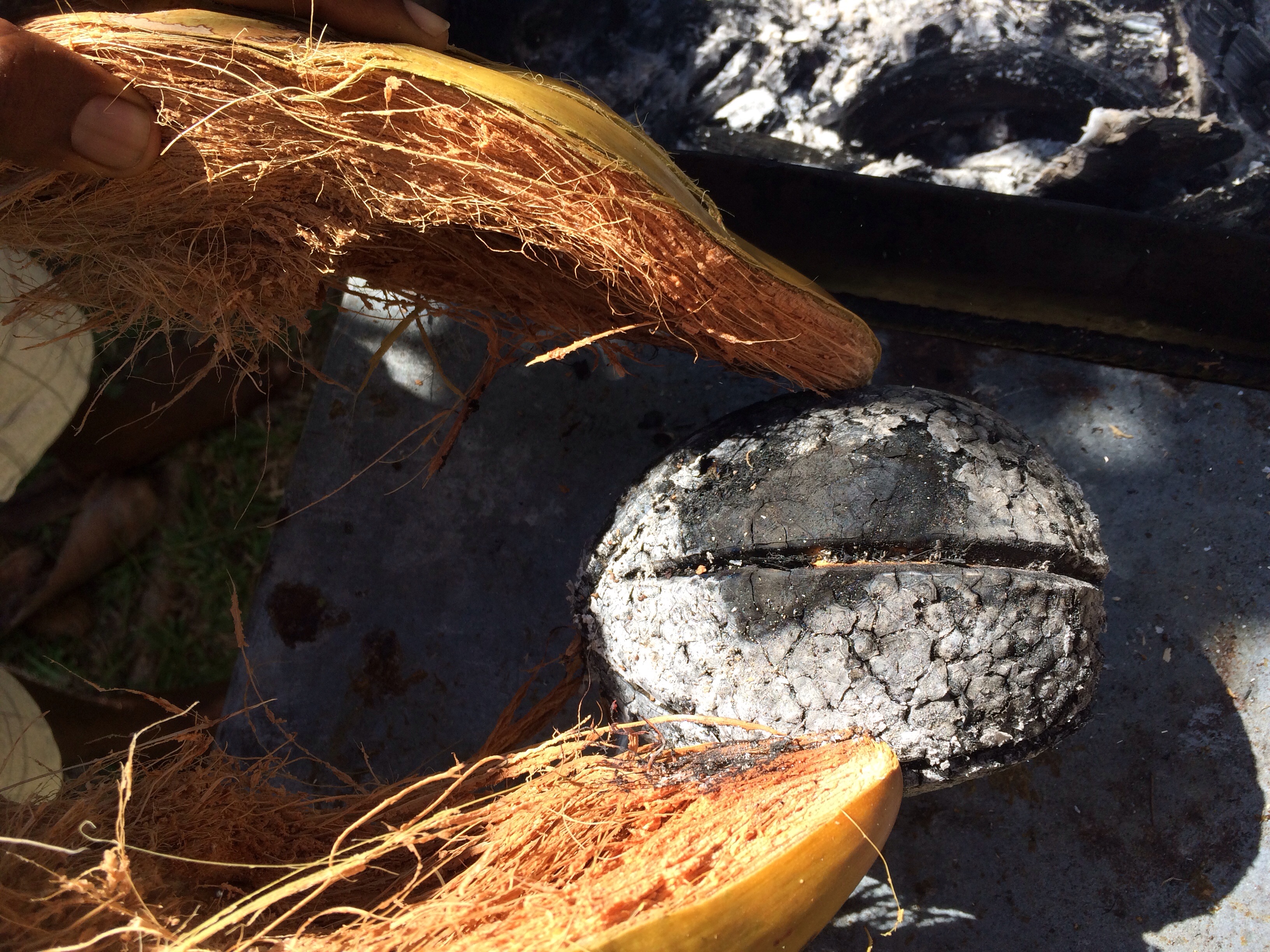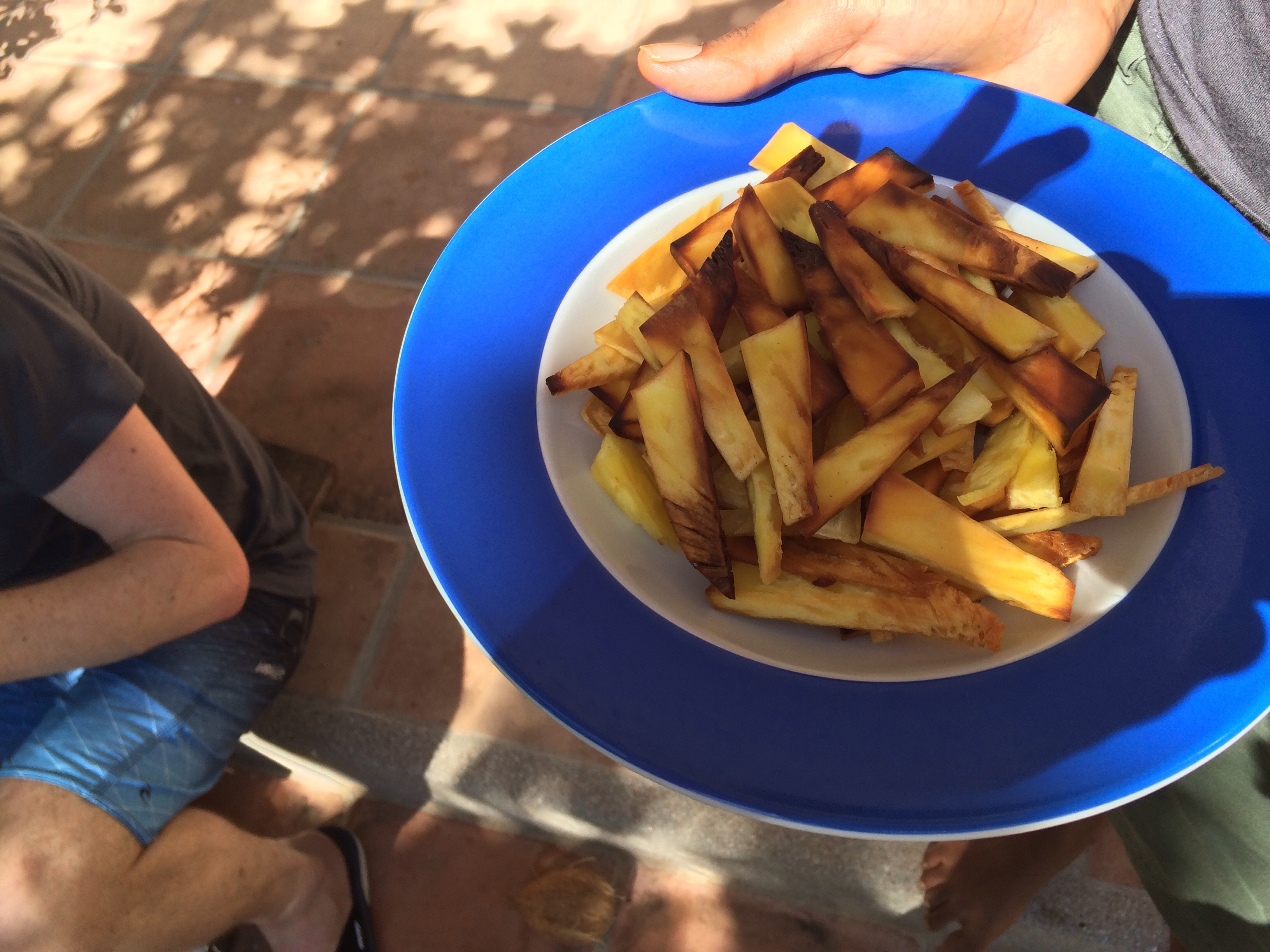 Wir haben auf 4-5 verschiedene Arten Brotfrucht gekostet – als ganze Frucht in der Kohle schwarz gegart (wird dann gern mit Butter gegessen / mit überm Grill gerösteten Kokosnuss-Stücken dazu), als frittierte Chips, in Stücken gekocht wie unsere Salzkartoffeln, diese kalt geworden als Salat mit Gemüsestückchen (erinnert auch an unsere Art Kartoffelsalat).