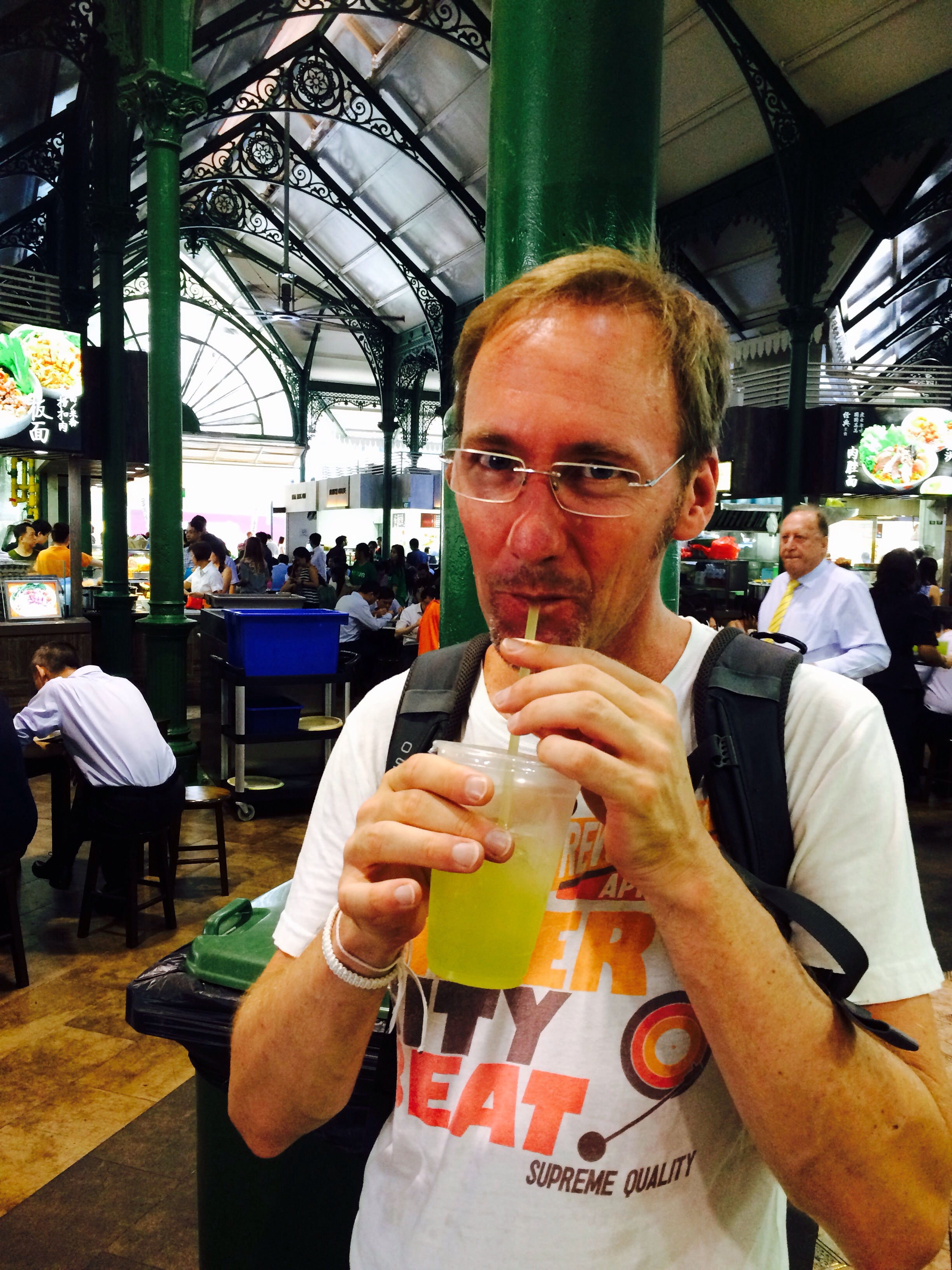 Marina Bay ist sehr beeindruckend, spannend für uns jedoch eher das Ufer gegenüber in der Nähe des Fullerton-Hotels steht der älteste Hawker-Centre ( Zitat: Das wohl schönste hawker centre ist der Lau Pa Sat Festival Market an der Robinson Road zwischen Waterfront und Chinatown (MRT NS 26, EW 14 Raffles Place). Essen und Trinken in allen Variation, extrem voll, da sich hier die Mitarbeiter des angrenzenden Bankenviertel treffen. Und die Menschen in Singapore lieben Essen! 🙂 Klasse auch, das man mit einer Serviette/ Taschentuch seinen Platz markieren kann, sich sein Essen holt und dann essen kann, ohne dass sich dort jemand anderes hingesetzt hat. Das funktioniert in SIN! Highlight für Sven: frisch gepresster Zuckerrohr-Saft!