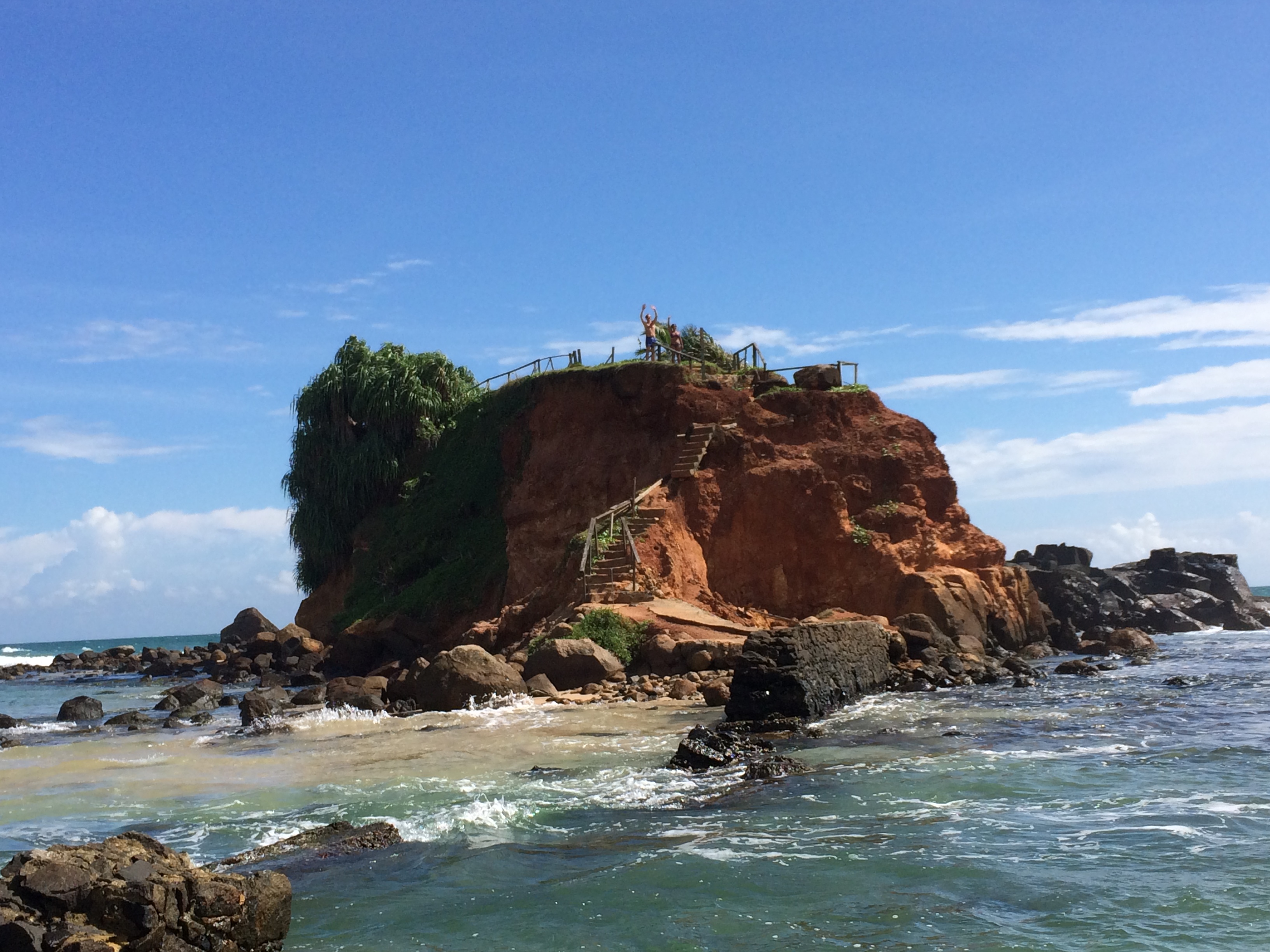 Der Ort Unawatuna heißt übersetzt „Falling Down“. Die Geschichte dazu erfahren wir von Thisara beim Besuch des Tempels „Rumassala Sri Viwekarama Vihara“ oberhalb von Jungle Beach und Japanes Peace Pagoda. Der Geschichte nach hat der König sich in eine junge Frau verliebt und entführt. Als diese krank wird, schickt der König den Affengott Hanoman los, um bestimmte Kräuter zur Heilung aus dem Himalaya zu holen. Hanoman vergisst den Namen der Kräuter und nimmt kurzerhand den ganzen Himalaya mit. Und auf dem Weg zurück fällt davon ein Stück ab, dort ist heute der Ort Unawatuna.