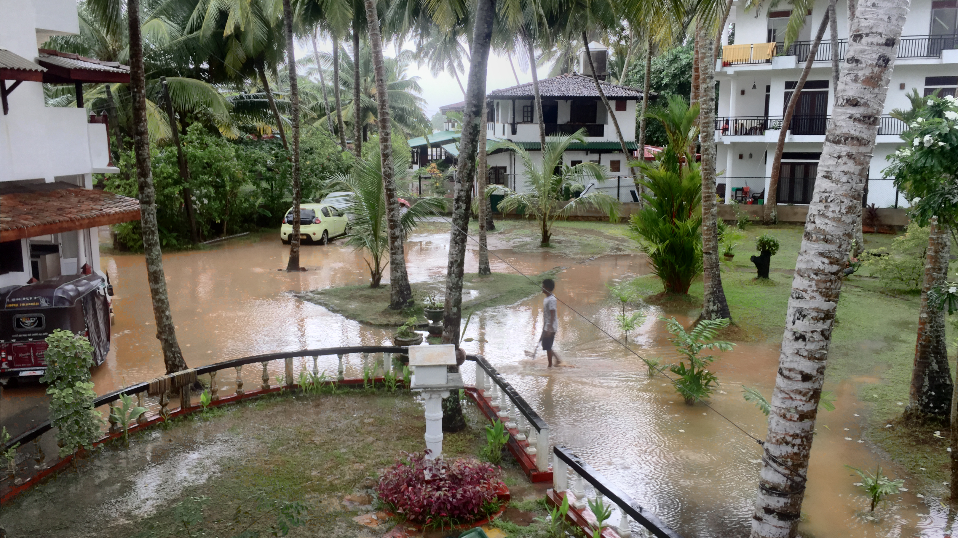 Gelebter Buddhismus in Sri Lanka: Zum Ende unseres Aufenthalts hat es mehrere Tage wirklich stark geregnet, das Grundstück gleicht einer Lagune und die Straße zum Strand steht regelmäßig unter Wasser.